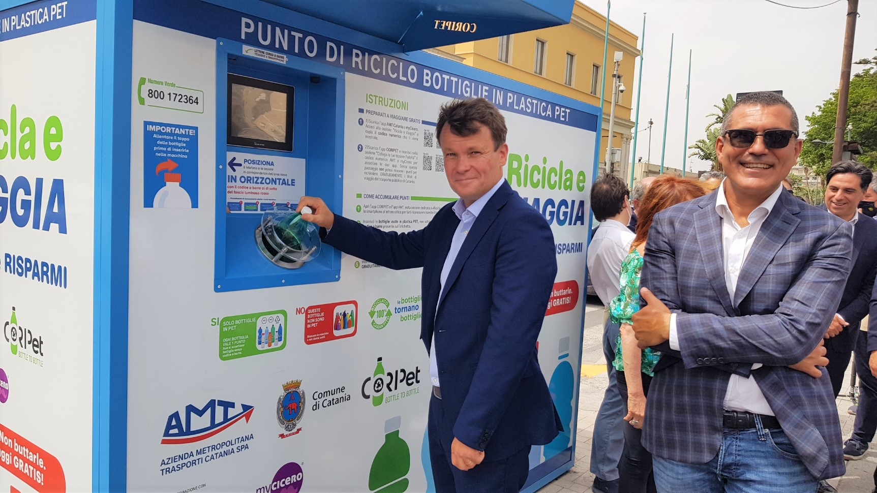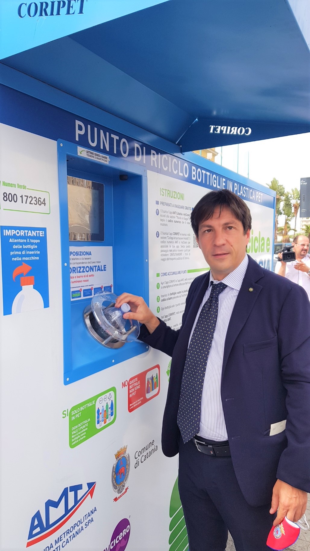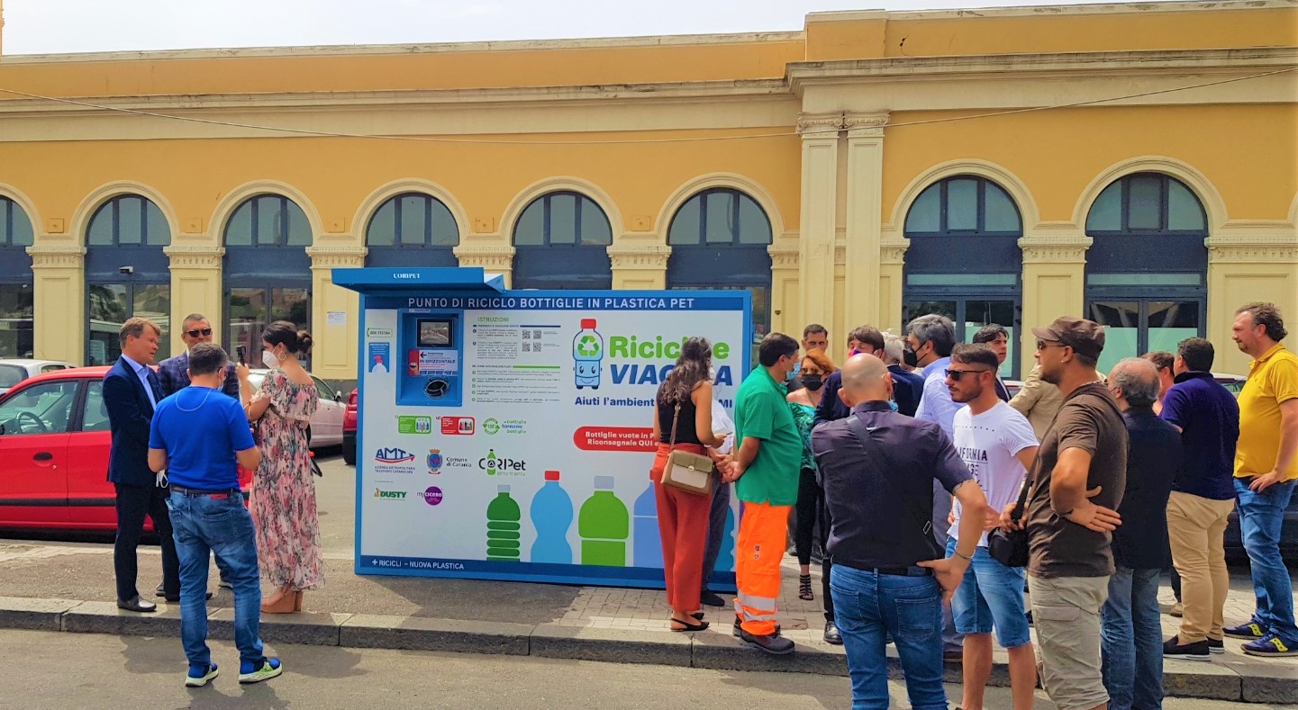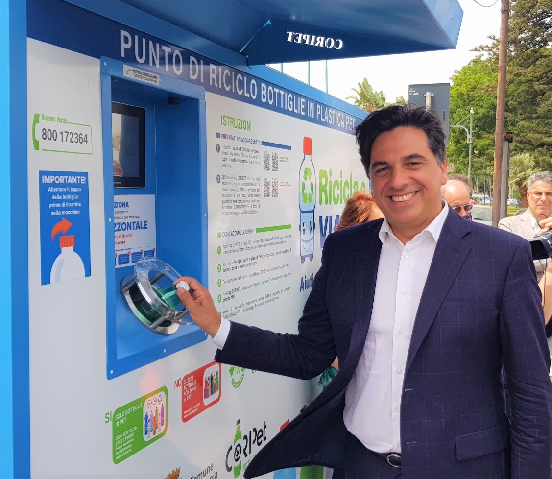 “Il Consorzio CoRipet ha installato la prima delle sei macchine che saranno presenti a Catania. Raccomando a tutti di non schiacciare le bottiglie ma di allentarne il tappo e di lasciare sempre l’etichetta indispensabile per identificare il codice a barre del prodotto. La bottiglia diventerà così nuovamente bottiglia, rispettando una direttiva europea la quale stabilisce che, entro il 2025, le bottiglie in PET vengano realizzate almeno con il 25% di PET riciclato” ha spiegato Massimo di Molfetta di CoRipet.