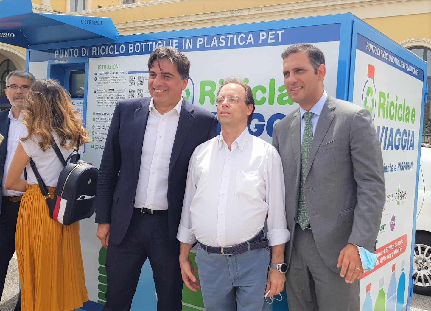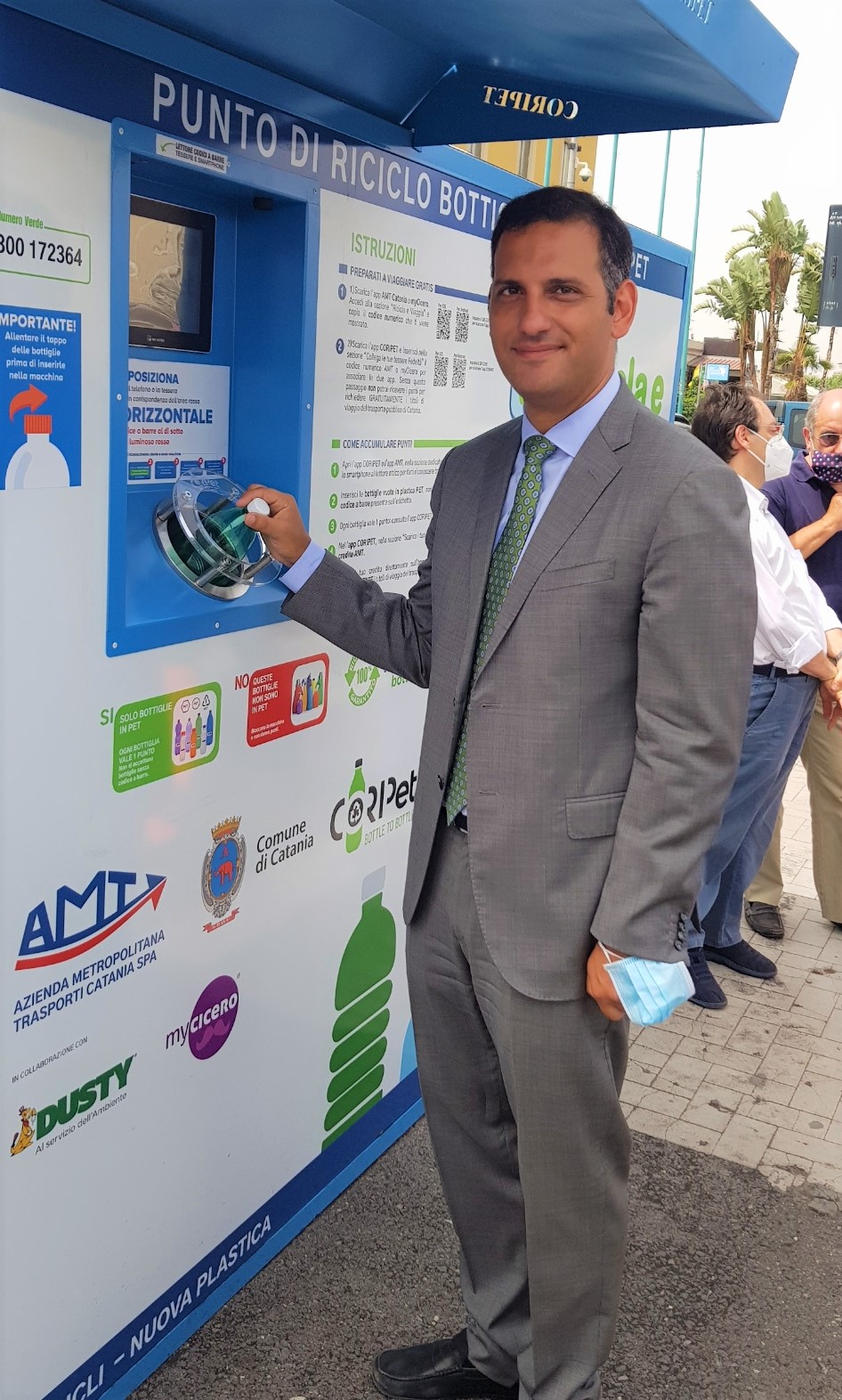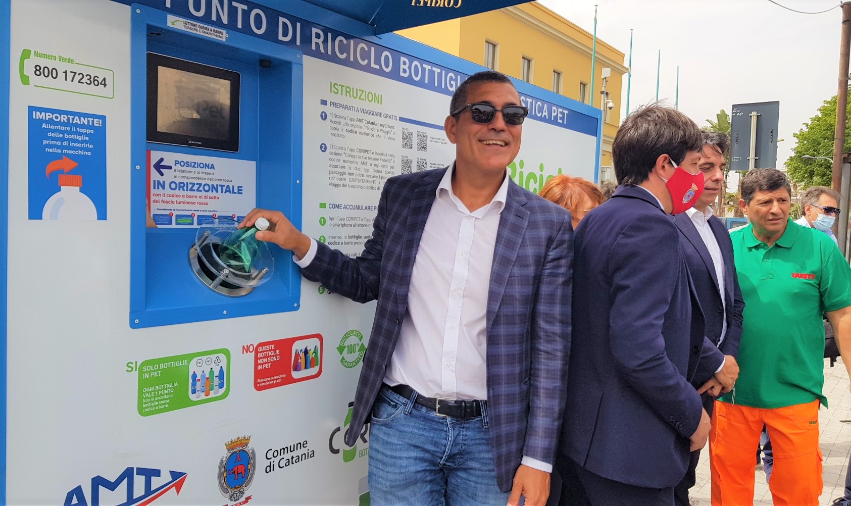 “Il Consorzio CoRipet ha installato la prima delle sei macchine che saranno presenti a Catania. Raccomando a tutti di non schiacciare le bottiglie ma di allentarne il tappo e di lasciare sempre l’etichetta indispensabile per identificare il codice a barre del prodotto. La bottiglia diventerà così nuovamente bottiglia, rispettando una direttiva europea la quale stabilisce che, entro il 2025, le bottiglie in PET vengano realizzate almeno con il 25% di PET riciclato” ha spiegato Massimo di Molfetta di CoRipet.