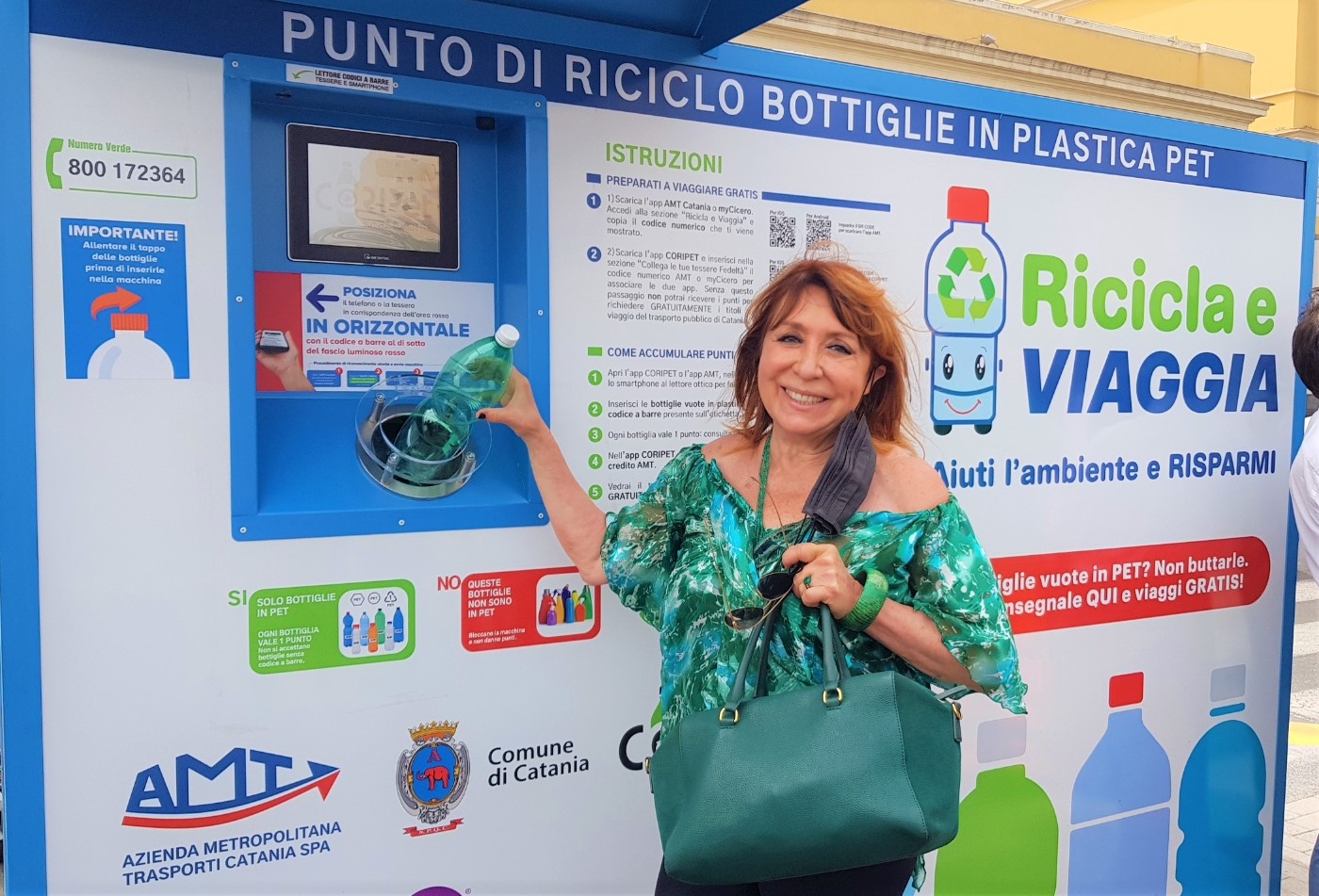 “Siamo felici di essere partners in questo bel progetto di economia circolare – ha sottolineato  Rossella Pezzino de Geronimo -. Abbiamo lavorato in sinergia con l’AMT, il Comune di Catania, Coripet e MyCicero per creare un vantaggio ai cittadini che utilizzano i mezzi pubblici. Una grande opportunità per i cittadini virtuosi di salvaguardare l’ambiente ed al contempo se si consegna una bottiglia di plastica all’interno dell’eco compattatore in cambio si avrà il biglietto gratuito per viaggiare su tutti i mezzi pubblici. È un progetto destinato ad avere successo. La nostra mission è quella di seminare bellezza. Nei prossimi sei giorni, nelle 6 postazioni in cui è stato posizionato l’eco-compattatore, saranno presenti le hostess che spiegheranno ai cittadini come scaricare l’App e poter imparare presto e bene come poter beneficiare dell’opportunità di viaggiare gratuitamente sugli autobus pubblici salvaguardando l’ambiente”.